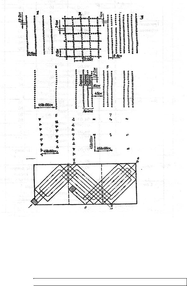 1 - обычный рядовой; 2 - перекрестный; 3- узкорядный; 4 - широкорядный; 5 - ленточный, трехстрочный; 6 - гнездовой; 7 - квадратно-гнездовой; 8 - перекрестно-диагональный