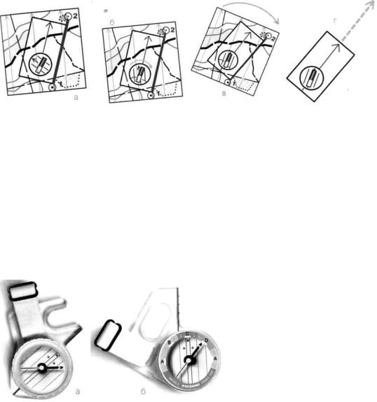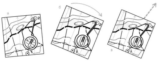 конечной точками на карте с краем платы (в отличие от компаса «на плате» у компаса «на пальце» плата имеет всего один прямой срез) (рис. 6, а). Затем следует развернуться вместе с компасом и картой в руке так, чтобы направление стрелки компаса совпало с направлением линий магнитного меридиана карты (рис. 6, б), после чего прямой срез платы укажет необходимое направление движения (рис. 6, в). Количество операций, необходимое для снятия азимута и движения в заданном направлении, сокращается, однако точность выдерживания направления на бегу несколько снижается, так как параллельность стрелки компаса и линий магнитного меридиана карты приходится оценивать приблизительно.