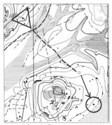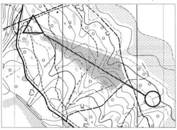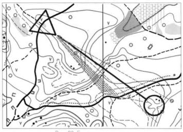 Обобщающее чтение карты также применяется в условиях высокой плотности ориентиров, но еще и в тех случаях, когда в поле зрения находятся только объекты крупных и средних размеров. Однако, в отличие от выборочного чтения карты, внимание обращается только на крупные ориентиры или совокупности мелких ориентиров, которые могут быть восприняты как единое целое. Так, например, если на карте среди относительно плоского и невыразительного рельефа выделяется область мелкого рельефа размером 200 на 300 метров, а до КП еще далеко, и нам совершенно не обязательно знать с большой степенью точности, где мы находимся, то вся эта зона может быть воспринята как один крупный площадной ориентир. То же самое касается ситуации, когда на относительно пологом склоне расположено несколько промоин, начинающихся от середины склона. В этом случае нам достаточно выйти в зону, где располагаются промоины, а если мы их не увидим, значит, мы прошли выше по склону. Такую же роль могут играть скопления точечных ориентиров, например, камней. Важно, чтобы примерные границы зоны компактного расположения объектов можно было различить на местности визуально. К обобщающему чтению карты относится также умение различать среди скопления мелких деталей рельефа более крупные формы.