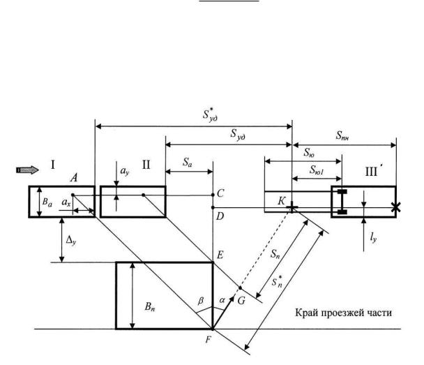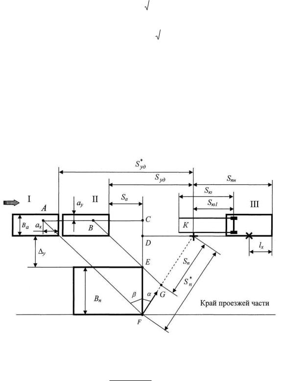 В случае если удар пешеходу нанесен боковой поверхностью автомобиля, при той же последовательности расчета, необходимо учесть расстояние от передней части автомобиля до места контакта его с пешеходом на боковой поверхности. Схема наезда при боковом ударе автомобилем пешехода показана ни рис. 2.