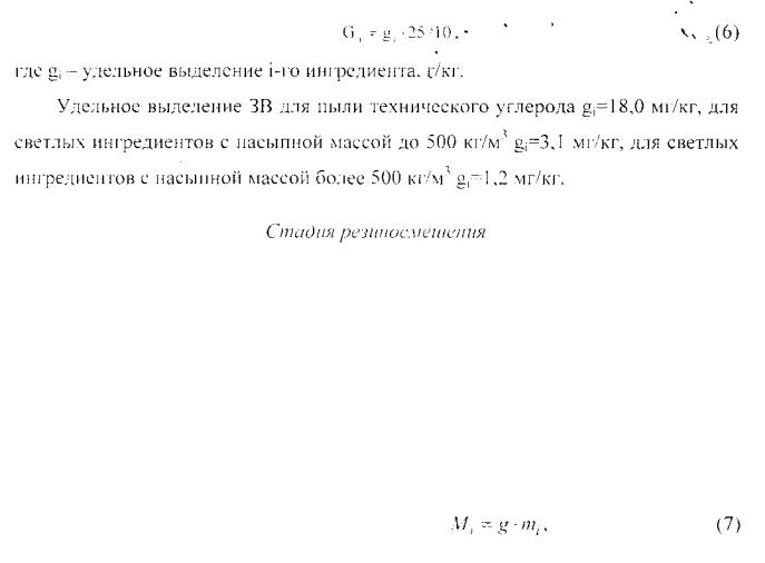 Валовое выделение пыли ингредиентовпри выгрузке резиновой чхМ:еси рассчитывается по формуле (1), где g - удельное выделение пыли в нижнем затворе резиносмесителя (120 мг/кг).