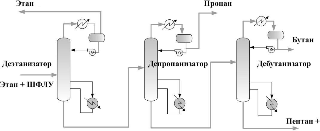 Сырьем установки является этан и ШФЛУ (если присутствует отдельная установка выделения сжиженных углеводородных газов). Продуктовые по- токи включают в себя этан, пропан, бутан и стабильный газовый конденсат.