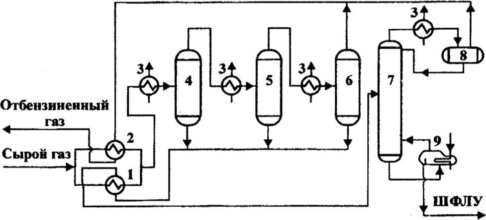 1, 2 – теплообменники; 3 – пропановые испарители; 4, 5, 6 – сепараторы; 7 –