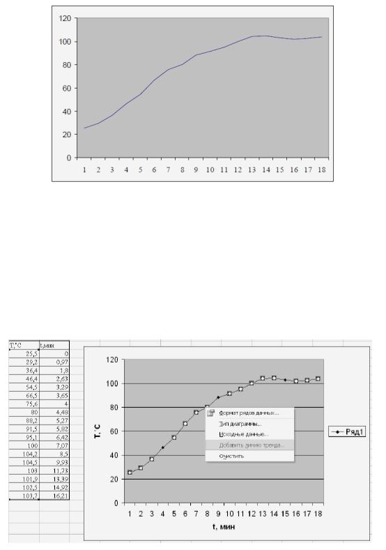 кривая для рассматриваемой зависимости не проведена. Эти данные в области диаграммы нужно выделить и затем щелкнуть правой кнопкой мыши. В раскрывшемся контекстом меню выбрать команду «Добавить линию тренда» (рис. 8).