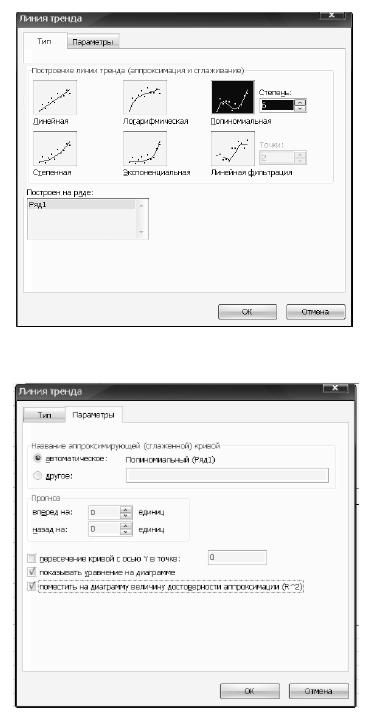 «Отображать уравнение», а так же «Поместить на диаграмму величину достоверности аппроксимации (R^2)» (Рис. 9, рис. 10).