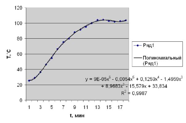 5. После нажатия кнопки ОК получаем результат (рис. 2.4.). В данном примере не видно выпадающих экспериментальных точек на линии тренда и величина достоверности R2 вполне удовлетворяет. Для построения интерполяционного полинома, проходящего через все экспериментальные точки, необходимо чтобы степень полинома была на единицу меньше количества точек. Очевидно, что чем выше степень полинома, тем больше аппроксимирующая кривая приближается к интерполяционному полиному.