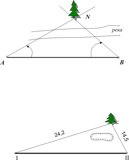 Этот способ применяют на открытой местности, когда положение местных предметов определяют измерением горизонтальных углов теодолитом с двух опорных точек между стороной хода и контурной точкой.