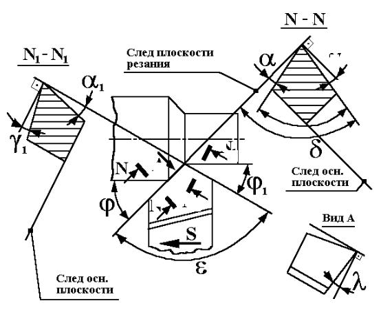 Главная секущая плоскость N-N проводится перпендикулярно проекции главной режущей кромки на основную плоскость. Вспомогательная секущая плоскость N1-N1 проводится перпендикулярно проекции вспомогательной режущей кромки на основную плоскость.