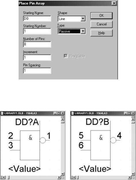 Для размещения массива выводов предусмотрена кнопка, соответствующая опции Pin Array меню Plase. Окно свойств массива выводов аналогично окну одного вывода и представлено на рис. 2.9.