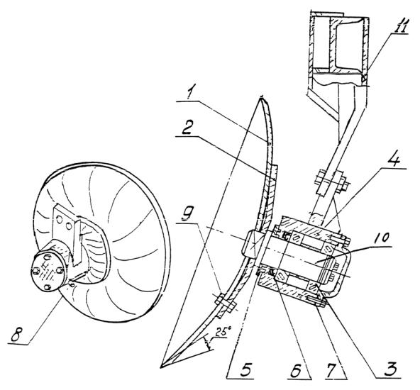 Нож 2 предназначен для образования посадочной щели. Он выполнен в виде вертикально установленного стального листа тра-