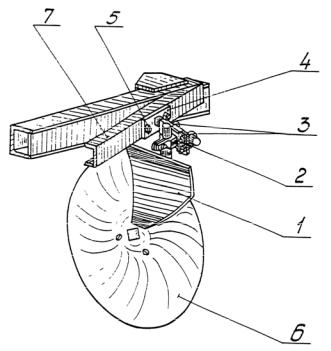 Плуг состоит из следующих составных частей (рис. 1): рамы 1, ножа 2, двух отвалов (левого и правого) 3, сошника 4, двух рыхлителей (левого и правого) 5, лобовика 6 и двух лыж (левой и правой) 7.