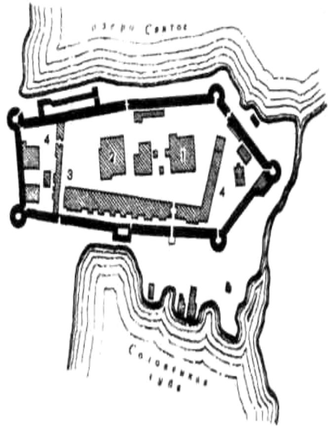 Рис. 6. Соловецкий монастырь. План крепости: 1- Спасопреображенский собор; 2 - Успенский собор с трапезной; 3 - кельи; 4 - хозяйственные постройки