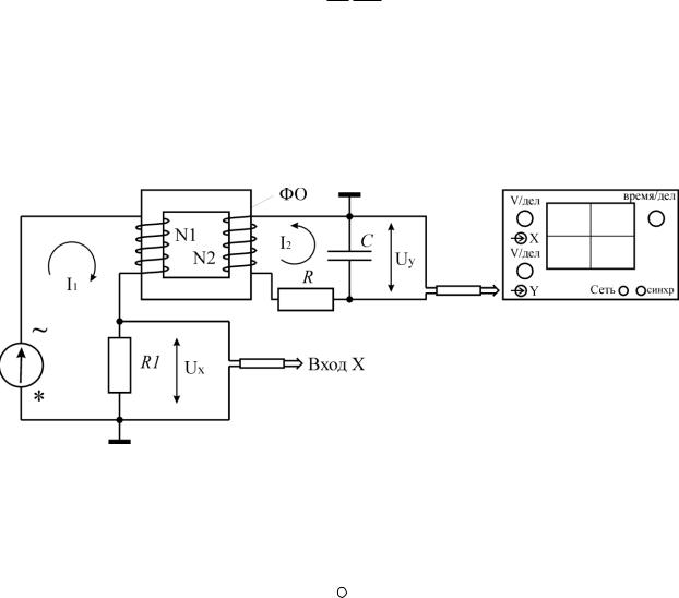 Схема установки содержит генератор переменного напряжения (блок ГН1); ФО – ферромагнитный образец (сердечник трансформатора); N1 – намагничивающая обмотка; N2 – измерительная обмотка; R и С – резистор и конденсатор RC-цепочки; R1 – резистор для получения напряжения Ux, электронный осциллограф.