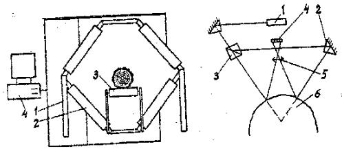 Блок измерителя рис. 2.4 б состоит из гелий-неонового лазера 1, оптических элементов в виде двух призм 2 и светоделительного кубика 3, многоэлементного приемника 4 с объективом 5. Лазер ЛГН-280, являющийся осветителем, формирует пучок лучей, который благодаря оптическим элементам падает на бревно 6. Рассеянный от объекта свет поступает через объектив на фотоприемник. Каждый из четырех лазеров формирует по два луча, поэтому можно измерить восемь точек поверхности бревна с точностью 1 мм. При движении бревна по конвейеру измерение осуществляется через равные промежутки времени по всей его длине.