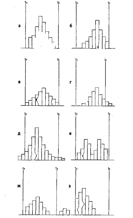 На рис. 5.2, з центр распределения смещен. Левая сторона распределения («3») имеет вид высокого края (в форме обрыва). Такая гистограмма отражает случаи, когда, например, требуется исправление параметра, имеющего отклонение от нормы, или искажена информация о данных и т. д. При этом необходимо уделить внимание случаю грубого искажения данных при измерениях и принять меры к тому, чтобы такие случаи не повторялись.