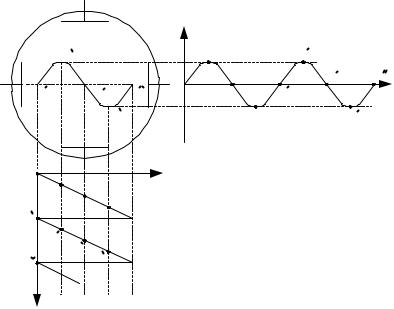 сигнала, развернутого во времени, необходимо смещать луч по оси X с равномерной скоростью. Это осуществляется подачей на отклоняющие пластины ОПх пилообразного напряжения Uх, которое вырабатывается генератором развертки ГР. Принцип развертки изображения иллюстрирует рис. 2, где даны кривые напряжений Uуи Uх, подводимых к пластинам Опу и ОПх, и получающееся при этом изображения на экране. Можно видеть, что при равенстве периодов напряжения Uуи Uх на экране получается неподвижное изображение одного периода Uу, т.к. синусоиды других перио-