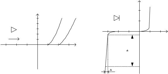 Основу светодиодов составляет излучающий p–n - переход. Его свечение вызвано рекомбинацией носителей зарядов при протекании прямого тока. Цвет излучения зависит от полупроводникового материала (GaAS, GaP) и степени его легирования, изменяясь от красного до зеленого. Прямые ветви BAX светодиодов показаны на рис.5,б. Светодиоды применяют в качестве сигнальных элементов, а также в цифрознаковых индикаторах и панелях, например в электронных часах, калькуляторах. Быстродействие светодиодов характеризуется временем 10-7 ÷10-9с.