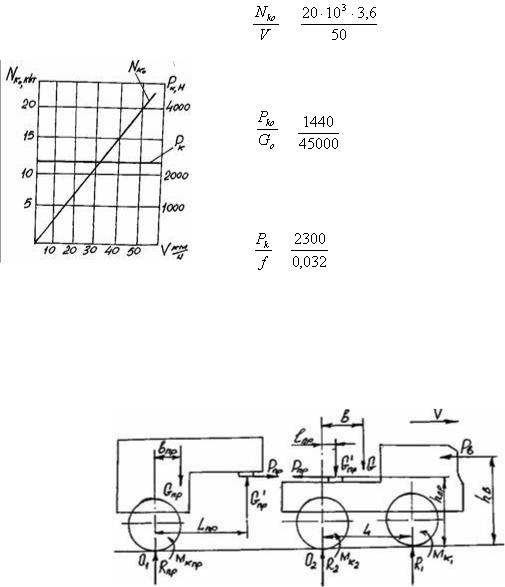 Исходные данные для расчета: сила веса тягача G=50000 H, его продольная база L=3,5 м, продольная координата центра тяжести b=1,4м, продольная координата точки сцепки ℓпр=0,35 м, высота точки сцепки над поверхностью дороги hпр=1,0 м, площадь лобового сопротивления тягача F=3,5 м2, коэффициент сопротивления воздуха тягача без учета дополнительного воздействия полуприцепа К=0,6нс2/м4, высота центра парусности hb=1,5 м, радиус колес тягача и полуприцепа rk=0,35м. Сила веса полуприцепа Gпр=30000 H, его продольная база Lпр=2,0м, продольная координата центра тяжести bпр=1,0 м.