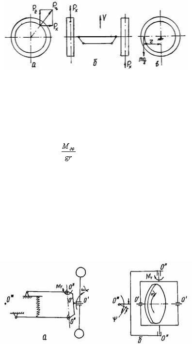 Величину массы m определяют при статической балансировке колеса путем измерения момента Мдб дисбаланса, создаваемого силой веса mg (рис. 5, в).
