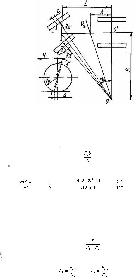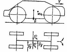где Рб.з. и Рб.п. - составляющие боковой силы Рб., действующие в точках В и А на заднюю и переднюю оси автомобиля (см. схему на рис.15).