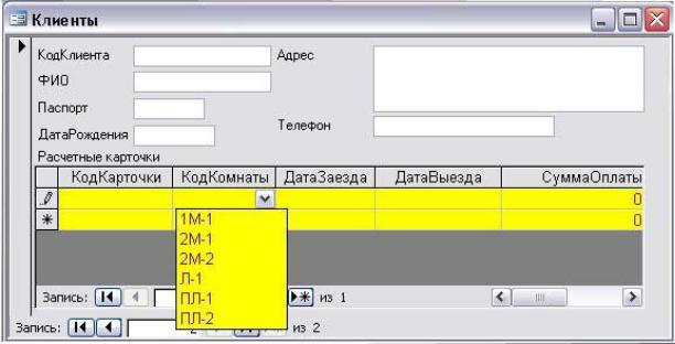 3.С помощью «мастера» форм создайте многотабличную форму «Размещение клиентов» на основе таблиц «Клиенты» и «Расчетные карточки» (вид представления данных – подчиненный, внешний вид – табличный, стиль – стандартный, код комнаты редактируется с помощью конструктора и должен выдаваться как поле со списком).