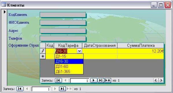 5. Создайте многотабличную форму «Клиенты», с помощью которой можно было бы на основе трех связанных таблиц фиксировать не только реквизиты клиентов, но и выбирать код тарифа из поля со списком, автоматически получая расчет суммы платежа (вид представления данных – подчиненный, внешний вид – табличный, стиль – международный):