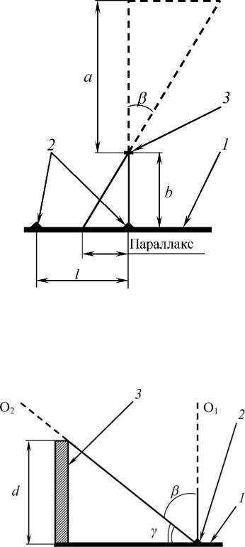 Рис. 1.4. Схема к расчету допустимого угла наблюдения по величине "колодезного" эффекта: 1 - плоскость циферблата; 2 - элемент шкалы, ближайший к борту окна корпуса; 3 - борт окна; О1 - точка наблюдения при а =0; О2 - точка