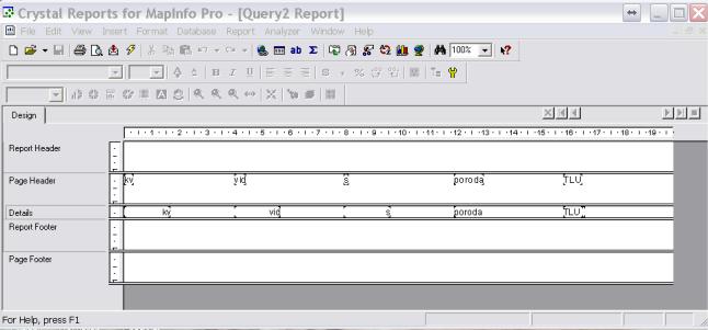 В комплект поставки ГИС MapInfo входит генератор отчѐтов «Crystal Reports». Возможности его настолько широки, что с его помощью можно создавать отчѐты практически любой сложности. Отчет можно создавать как на основе таблицы атрибутивных данных, так и на основе результатов запросов. Рассмотрим пример создания отчѐтной формы. Для этого в меню MapInfo необходимо выбрать пункт меню «Программы/Crystal Reports/Новый отчѐт». Далее необходимо выбрать таблицу с атрибутивными данными. На экране появится генератор отчѐтов, в котором автоматически появится шаблон примитивного отчѐта для выбранной таблицы (рис.7.1).