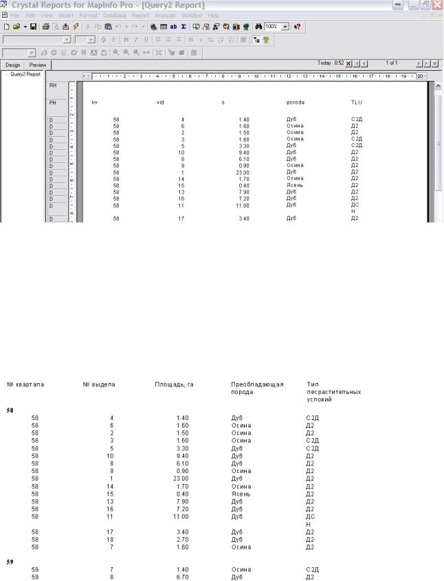 Предварительный просмотр такого отчѐта будет выглядеть, как показано на рисунке 7.2. Мы получили список атрибутивных данных, который оформлен в виде отчѐта, предназначенного для печати на принтер. В шапке таблицы (Page Header) показаны заголовки колонок, которые содержат название полей из структуры таблицы. Эти надписи можно изменять. В разделе Details в квадратных скобках приведены названия колонок таблицы, вместо которых при печати будут выводиться значения. В разделе Page Footer можно разместить информацию, которая будет отображаться в конце каждой страницы, например, постраничные итоги по какой-либо колонке. Раздел Report Footer предназначен для размещения в каких-либо надписей в конце отчѐта, например, общие итоги по всей таблице.