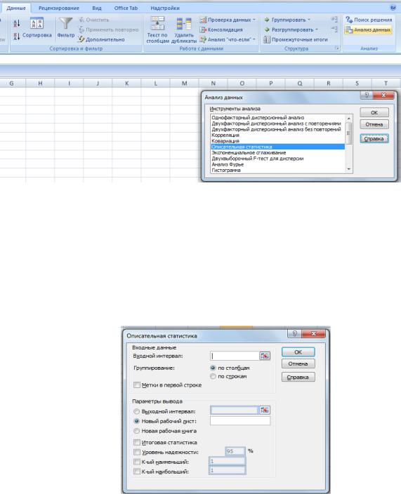 Для использования инструмента «Описательная статистика» необходимо в MS Excel, на вкладке «Данные» выбрать «Анализ данных» (см. рисунок 1).
