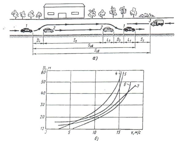 а – схема обгона; б – дистанция безопасности при следовании автомобиля в потоке где:1- обгоняющий автомобиль; 2 – обгоняемый автомобиль; 3 – встречный
