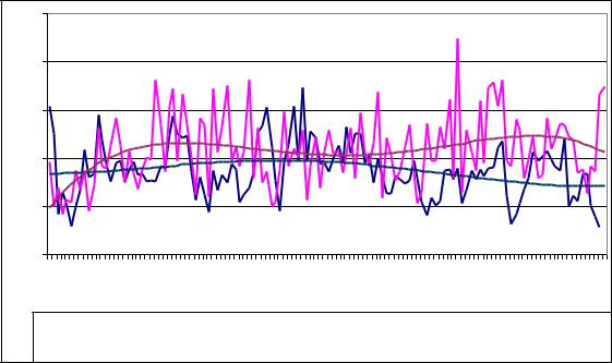 Рис. 2. Динамика значений ГТК и индексов прироста (%) сосны обыкновенной Усманского бора и их сглаженные полиномом 4-й степени тренды