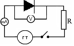 Для исследования и построения ВАХ полупроводникового диода схема экспериментальной установки имеет два варианта. В схеме кроме исследуемого диода имеется входное сопротивление а также вольтметры и амперметры.