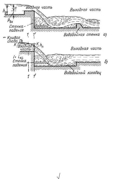 давлений в сечении над ребром стенки падения отличается от гидростатического. При свободном падении струи избыточное давление в нижних точках потока в сечении 1'-1' равно нулю.