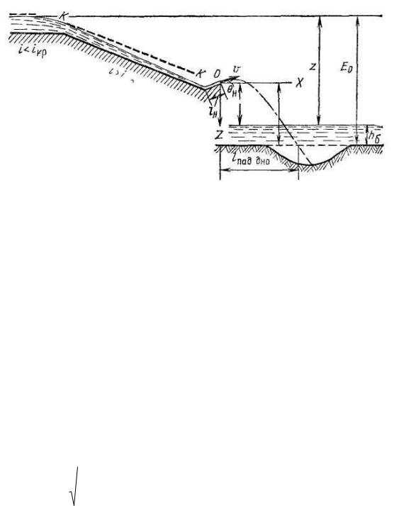 Данные о глубине и скорости в конце быстротока являются исходными для расчета отброса струи, который ведется по зависимостям, найденным при рассмотрении свободного падения струйки, проходящей через центр выходного сечения потока на консоли.