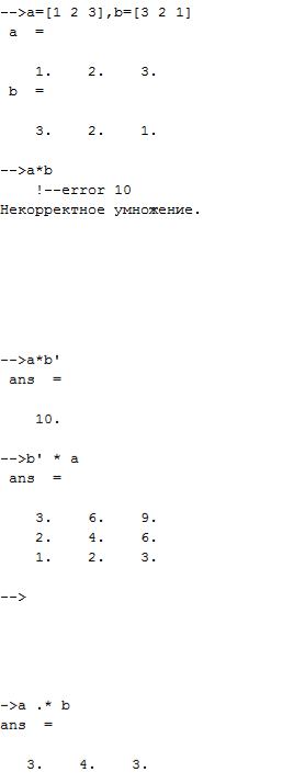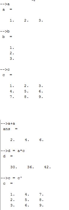 В Scilab можно производить различные математические операции с матрицами. Строки матриц отделяются друг от друга при помощи символа «;». Определим матрицу-строку a , матрицу-столбец b и двумерную матрицу c :