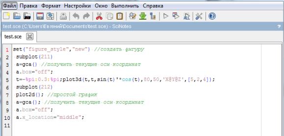 Для удобства написания функций в Scilab имеется встроенный редактор Scinotes. Он позволяет редактировать тексты функций, сохранять их в скриптах (файлах с расширением .sci) выполнять их в режиме отладки, содержит функцию автодополнения кода, а также средства непосредственной передачи текста программы в среду Scilab на выполнение.