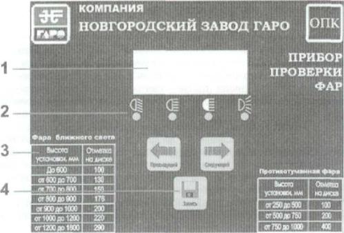 ется с помощью светоизлучающего диода (далее – светодиод); таблица 3 с данными для регулировки фары; клавиши управления прибором 4.