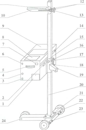 Прибор состоит из основания 21 на колесах; стойки 20, установленной на основании вертикально; оптической камеры 9 и ориентирующего устройства
