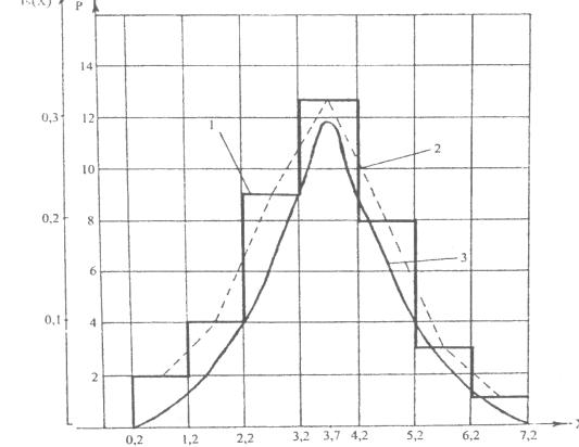 Рис. 1.2 Гистограмма (1), экспериментальная (2) и нормальная (3) кривые распределения