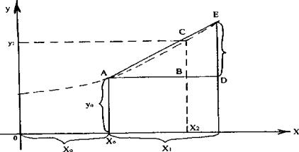 Экстраполяция заключается в нахождении функции y=f(x) для значений аргументов, лежащих за пределами факторов, задействованных в эксперименте. Пусть для функции y=f(x) известны ее табличные значения f(x0)=y0 и f(x0+h)=y1 в двух соседних узлах при х0 и х1= x0+h и неизвестны