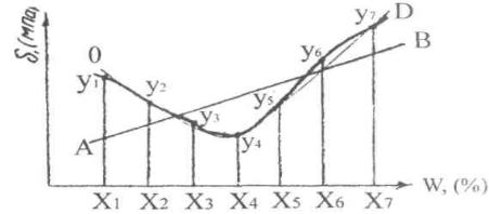 Так очевидно, что экспериментальную кривую у1 ;у2 ...у7 (рис.6.1), характеризующую зависимость твердости почвы (δ)от ее влажности (W,%), едва ли целесообразно аппроксимировать линейной функцией (линия АВ).
