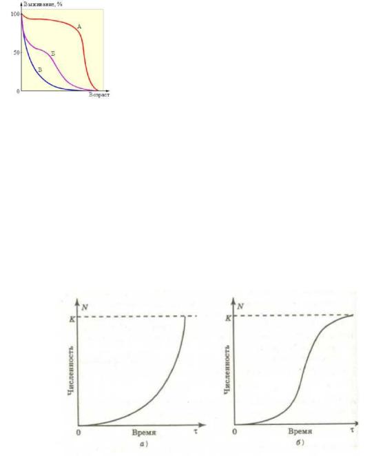 Данные таблиц выживания позволяют построить кривые выживания. Выделяют три основных типа кривых выживания (рис. 1). Кривая А типа, когда на протяжении всей жизни смертность мала, резко возрастая в конце нее, характерна для насекомых, которые обычно гибнут после кладки яиц (ее называют «кривой дрозофилы»), к ней приближаются кривые выживания человека в развитых странах и некоторых крупных млекопитающих.
