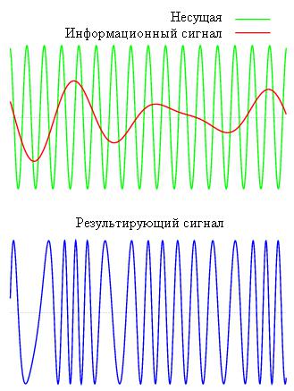 Радиосигнал состоит из несущего колебания и двух синусоидальных колебаний, называемых боковыми полосами, каждое из которых имеет частоту, немного отличную от ωc. Для синусидального сигнала, использованного здесь,