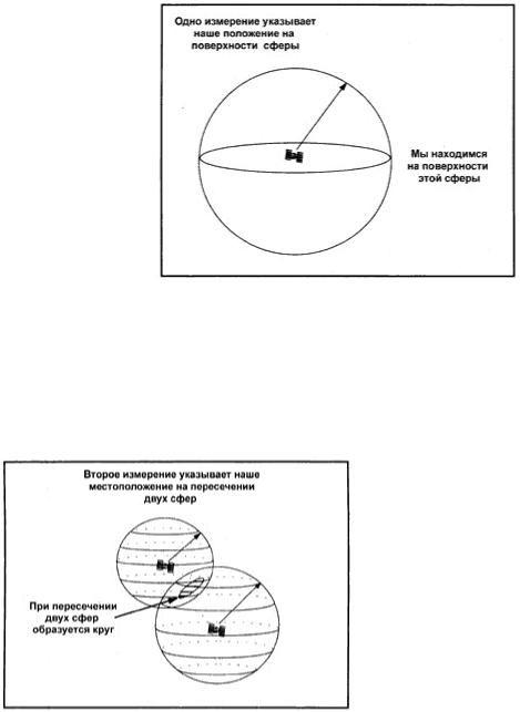 Если известно также расстояние и до второго спутника, то определяемое местоположение будет расположено где-то в круге, задаваемом пересечением двух сфер (рис. 2).
