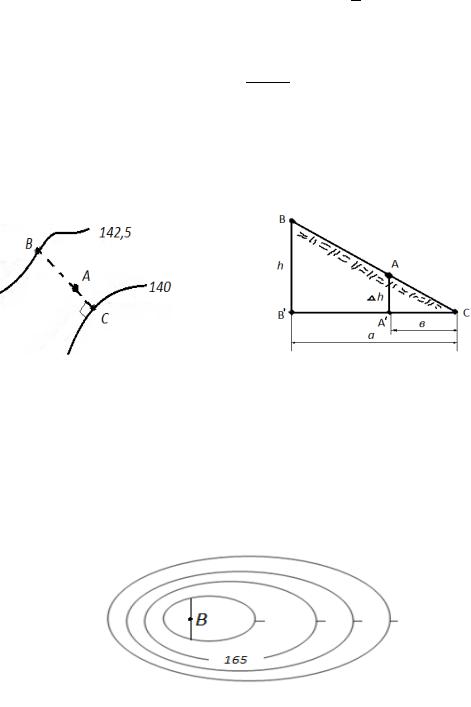 Высота координатной точки на земной поверхности определяется по карте относительно горизонталей. Через точку, лежащую между горизонталями, проводится линия, которая пересекается с горизонталями под прямым углом (линия наибольшего ската) (рис.14).