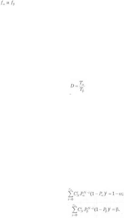 сит са с вероятностью 1-а. Аналогично, уравнение (4) есть математическая формулировка условия, заключающегося в том, что в выборке объема Nиз партии негодных изделий число отрицательных исходов испытаний не пре-