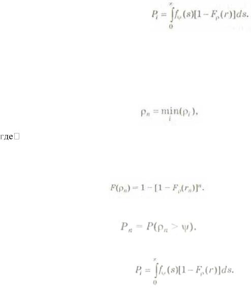 Модель слабейшего звена используется при исследовании надежности системы, состоящей из последовательного соединения звеньев, при отказе одного из которых выходит из строя вся цепь. Примером может служить электрическая цепь, состоящая из п одинаковых элементов и подвергающаяся тепловой нагрузке. Если принять допущение, что тепловая нагрузка является единственной причиной отказов, то элемент, имеющий наименьшую стойкость к тепловым нагрузкам, выйдет из строя первым. Вероятность безотказной работы при этом имеет вид