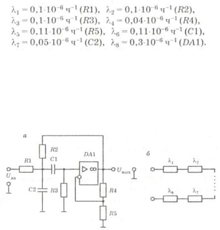 Пример № 5. Определить вероятность безотказной работы полосового фильтра (рис. 3, а) в течение времени t = 1000 ч. Коэффициент нагрузки