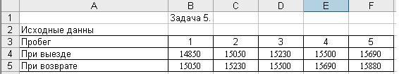 2.В ячейку В8 занесите формулу =B5-B4, позволяющую рассчитать пробег за сутки, и распространите ее в ячейки В8:F8.
